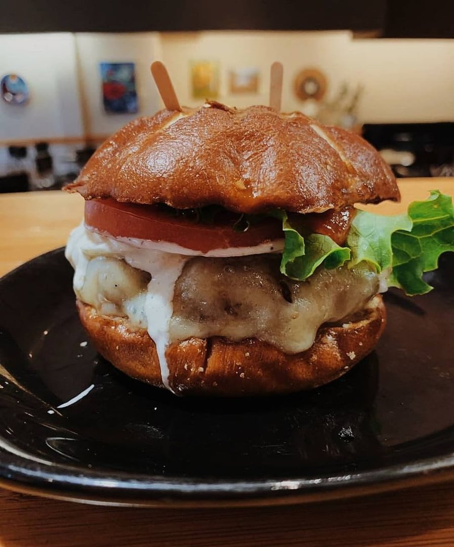 On a pretzel roll with tomato, aged cheddar, red onion, roasted red pepper lettuce & herb feta mayo.